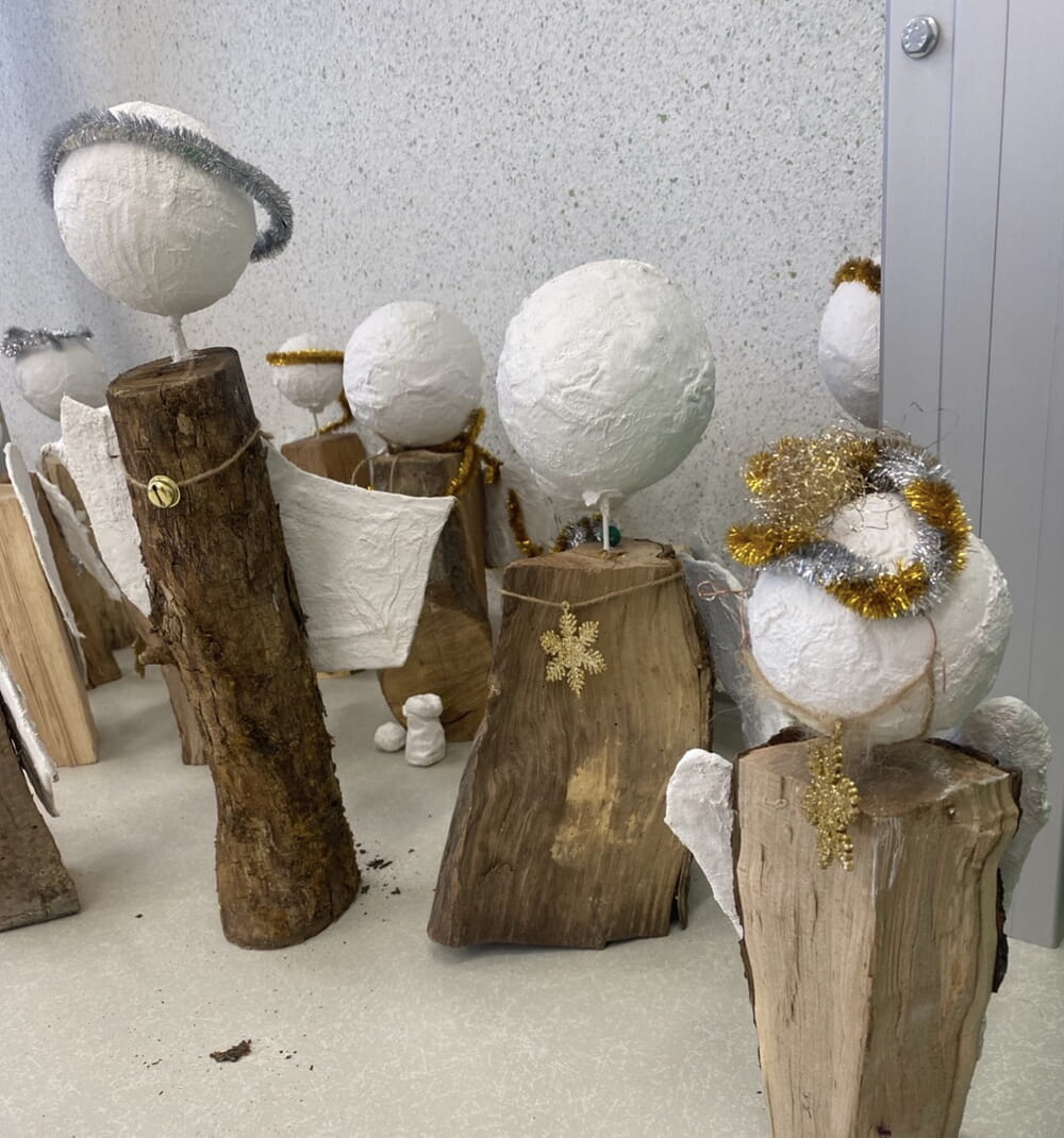 Im Kunstunterricht der dritten Klassen entstanden Holzscheiten-Engel als kreatives Projekt. Für die Unterstützung und das Mitgeben der Holzscheite bedanken wir uns herzlich bei den Eltern.